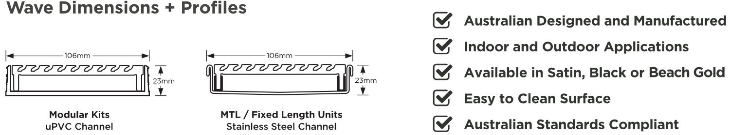 Available in linear Modular Kits, Made-to-Length or Fixed Lengths, the Wave Grate can be finished in Satin, Black and Beach Gold and is guaranteed not to fade.